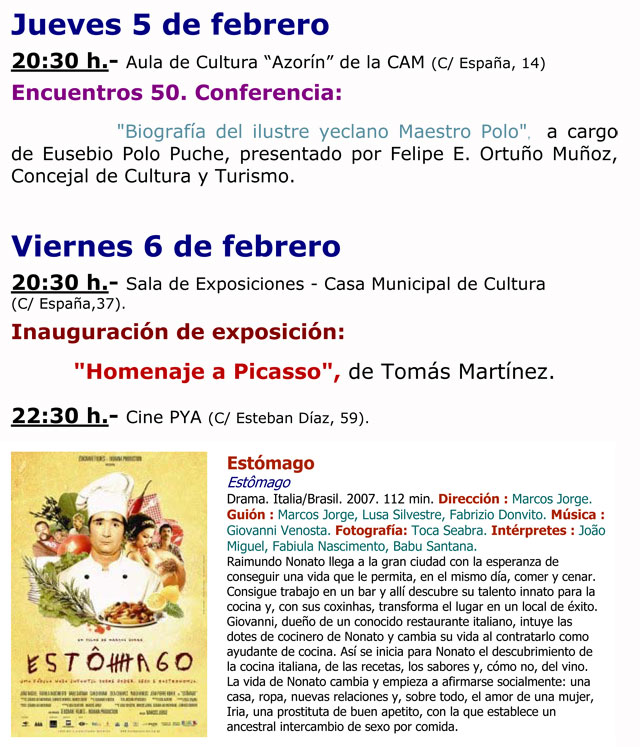 Yecla Noticias Agenda cultural de Yecla del 5 al 8 de febrero 05/02/2009 Agenda cultural de Yecla del 5 al 8 de febrero Fuente: Ayuntamiento de Yecla