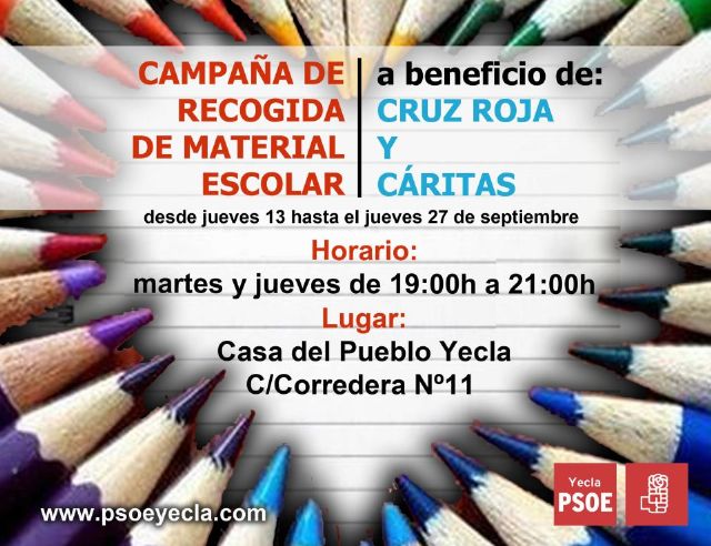 Desde el PSOE de Yecla hacemos un llamamiento a todos los yeclanos y los invitamos a participar en esta campaña solidaria aportando material escolar que será entregado para su distribución a Cruz Roja y Cáritas española. Las entregas podrán realizarse en la Casa del Pueblo de Yecla (C/Corredera, 11) los martes y jueves en horario de 19 a 21 h.