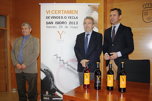 El consejero de Agricultura y Agua, Antonio Cerdá, presentó hoy, junto con el alcalde de Yecla, Marcos Ortuño, y el presidente de la Denominación de Origen Yecla, Pascual Molina, el VI Certamen Selección Vinos de Yecla, que se celebra en el municipio el próximo viernes, 24 de mayo. Esta edición reunirá más de 50 muestras de vino de esta zona productora que serán evaluadas por un jurado de cata compuesto por críticos y enólogos.