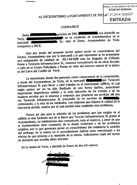 El Grupo Socialista denuncia la deuda de 40 mil euros que dejó Tarancón S.L. A una empresa yeclana al prescindir de sus servicios y contratar a otras empresas que bajaron la calidad de los materiales.