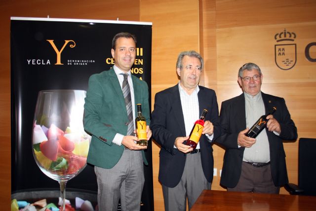 El consejero de Agricultura y Agua, Antonio Cerdá, presentó hoy, junto con el alcalde de Yecla, Marcos Ortuño, y el presidente de la Denominación de Origen Yecla, Pascual Molina, el VII Certamen Selección Vinos de Yecla, que se celebra en nuestra ciudad mañana, 30 de mayo.