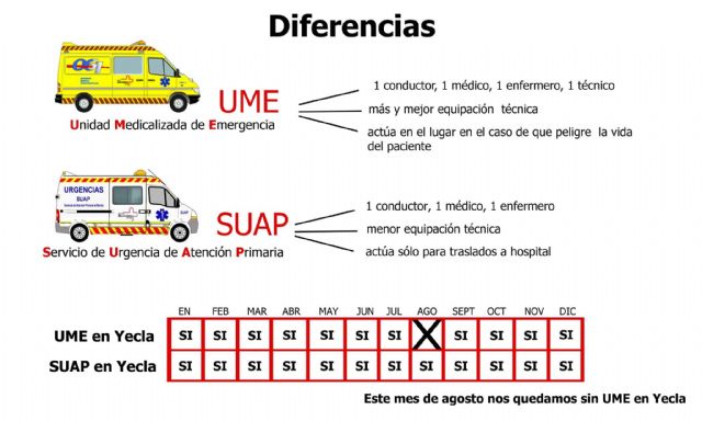 El equipo de gobierno de Yecla ha respondido al comunicado del Grupo Socialista señalando que durante el mes de agosto "una ambulancia medicalizada" estará presente en el municipio las 24 horas. Lo que el equipo de gobierno no dice es que se trata de una ambulancia de Servicio de Urgencias de Atención Primaria (SUAP) mientras que la Unidad Móvil de Emergencias (UME) ha sido trasladada no a Jumilla, como pensábamos, sino a Los Alcázares como refuerzo sanitario para la costa durante este verano. Ante un accidente o circunstancia en la que el paciente se debata entre la vida y la muerte, la UME está mejor preparada que el SUAP, cuya actuación es la de atender al paciente para trasladarlo al Hospital más próximo. Esto es lo que consiente el equipo de Marcos Ortuño, que el UME de Yecla esté ahora "en la playa".