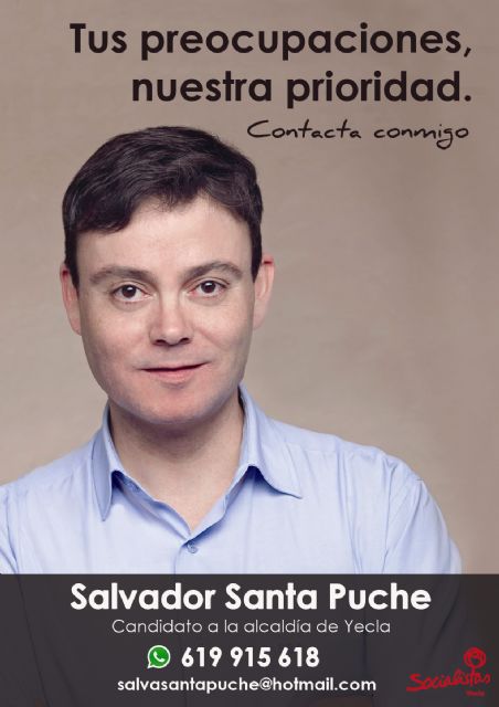 Además el candidato socialista pone a disposición de los ciudadanos la página 'Salvador Santa Puche' en Facebook, la dirección @SalvaSanta en Twitter y el correo electrónico 'salvasantapuche@hotmail.com'. Junto a estas herramientas el candidato también responderá llamadas y mensajes por WhatsApp con su número de teléfono a las preguntas de los ciudadanos. De esta manera los socialistas yeclanos invitan a los ciudadanos a exponer ante el candidato sus problemas, ideas e iniciativas de forma más pormenorizada y cercana.