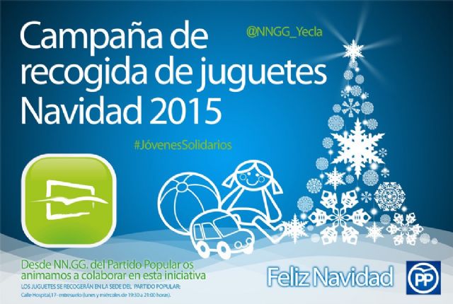 Nuevas Generaciones del Partido Popular de Yecla, se solidariza con las familias más necesitadas de nuestra ciudad, a través de su tradicional campaña navideña de recogida de juguetes "JÓVENES SOLIDARIOS", con el fin de que ningún niño se quede sin su regalo de Navidad.