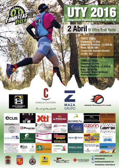 A apenas cinco días para el regreso de la Running Mountain 2015/16, este próximo domingo en la II Nogalte Trail Xtreme, toca vislumbrar la siguiente cita en el calendario del circuito de carreras de montaña de la Región de Murcia. Será el sábado 2 de abril cuando Yecla vuelva a erigirse en capital regional del ultra trail, en el marco de la UTY2016, VI Ultra Trail Vuelta al Término de Yecla. En esta ocasión, se desarrollarán dos citas puntuables en la Running Mountain, con la Tomillo Trail (21km. + 1.240m. de desnivel) y la Tinto Trail (73km. + 3.420m. de desnivel), albergando además esta última el Campeonato de la Región de Murcia Absoluto de Ultra Trail.