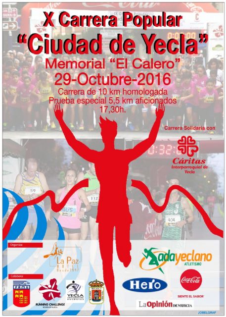Como ya marca la tradición y el calendario, Yecla volverá a albergar el fin de fiesta en la Running Challenge 2015/16. Así será el sábado 29 de octubre, cuando tendrá lugar la 26ª y última cita del circuito de carreras populares de la Región de Murcia, en el marco de la X Carrera Popular “Ciudad de Yecla” Memorial Pedro Muñoz “EL CALERO”. A las 16:30h. darán comienzo las pruebas de menores, estando previsto a partir de las 17:30h. el plato fuerte con las carreras absolutas, tanto la cita de 5.500m. como la de 10km. En este último caso, sobre ese circuito homologado por la RFEA con salida y meta en las inmediaciones del Parque de la Constitución.