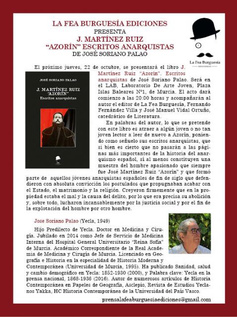 El próximo jueves, 22 de octubre, se presentará el libro J. Martínez Ruiz "Azorín". Escritos anarquistas de José Soriano Palao. Será en el LAB, Laboratorio De Arte Joven, Plaza Islas Baleares, N° 1, de Murcia. El acto dará comienzo a las 20:00 horas y acompañarán al autor el editor de La Fea Burguesía, Fernando Fernández Villa y José Manuel Vidal Ortuño, catedrático de Literatura.