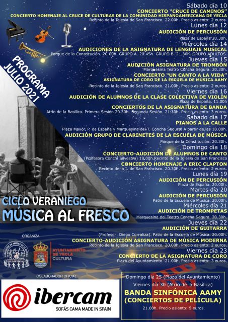 Con esta actividad, que cuenta con la colaboración de IBERCAM, desde la Asociación de Amigos de la Música de Yecla pretendemos, por un lado llenar de música las tardes-noches y alguna mañana de julio en nuestra ciudad, ofreciendo la posibilidad de disfrutar de un concierto o recital al "fresco", y por otra parte mostrar a toda la sociedad yeclana el trabajo que desarrolla la Asociación, a través de su Banda Sinfónica y su Escuela de Música.