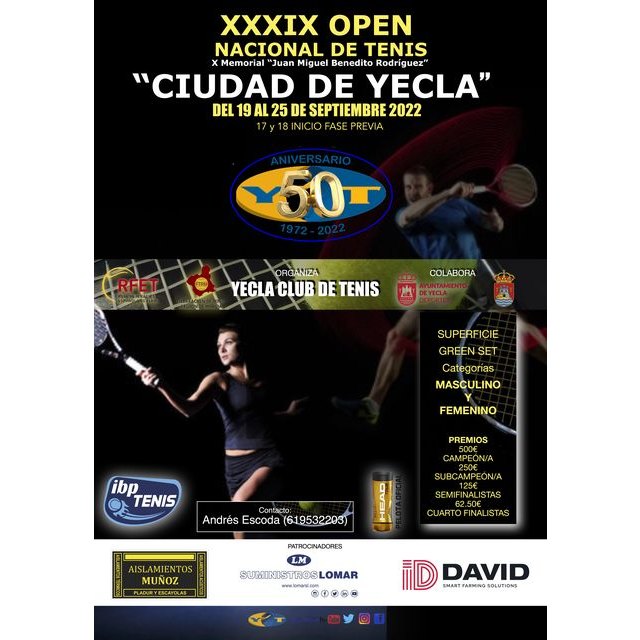 El Yecla Club de Tenis organiza el XXXIX Open Nacional de Tenis “Ciudad de Yecla” (X Memorial “Juan Miguel Benedito”). El torneo, (uno de los más longevos del calendario nacional), se celebra del lunes 19 al domingo 25 de septiembre, la fase previa se jugará el sábado 17 y el domingo 18. El Torneo rinde tributo desde hace 10 años a Juan Miguel Benedito, (Alcalde de Yecla, socio y directivo del club), recordando de esta manera la gran aportación y apoyo que Juan Miguel siempre dedicó en vida a nuestro club.