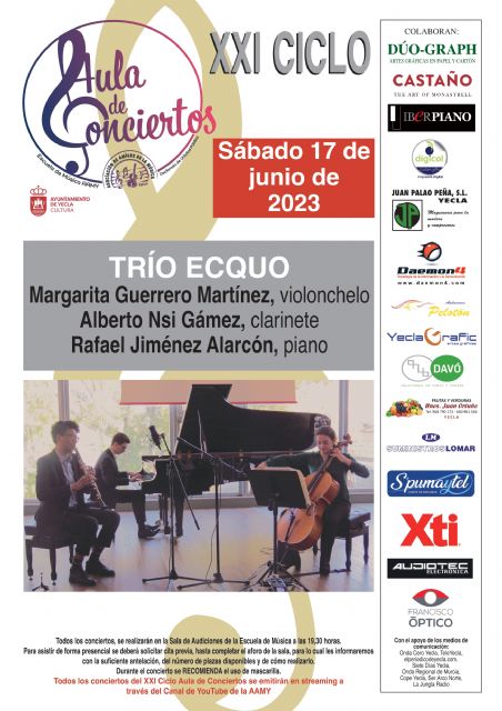 Este noveno concierto del Ciclo se celebrará en laSala de Audicionesde la Escuela de Música a las19:30 h. con aforo limitado para 90 personas y previa reserva de sillas contactando con la Escuela de Música. Será interpretado por el Trío Ecquo, formado por los jóvenes músicos murcianos: Margarita Guerrero Martínez, violonchelo; Alberto Nsí Gámez, Clarinete y Rafael Jiménez Alarcón, Piano.