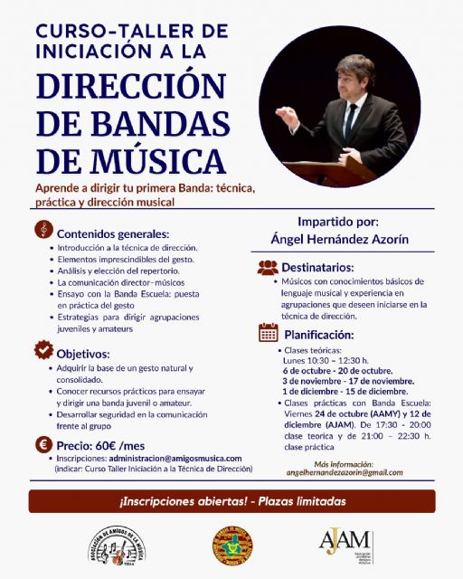 La Asociación de Amigos de la Música de Yecla, informa que se va a llevar a cabo el Curso-Taller de Iniciación a la Dirección de Bandas de Música, que será impartido por Ángel Hernández Azorín. Este curso está organizado por la Asociación Jumillana de Amigos de la Música de Jumilla (AJAM) y la Asociación de Amigos de la Música de Yecla (AAMY) con la colaboración de la Federación de Bandas de Música de la Región de Murcia,